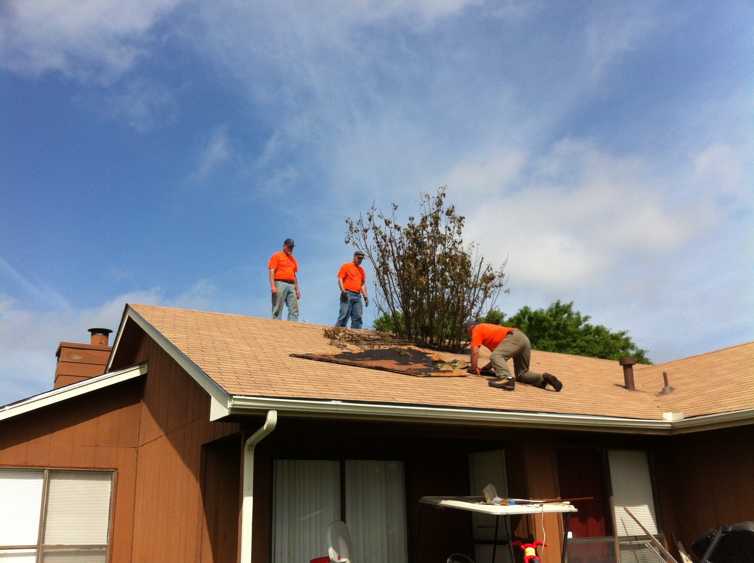 In a different neighborhood now. A large branch of a tree was punched through the roof of this house.