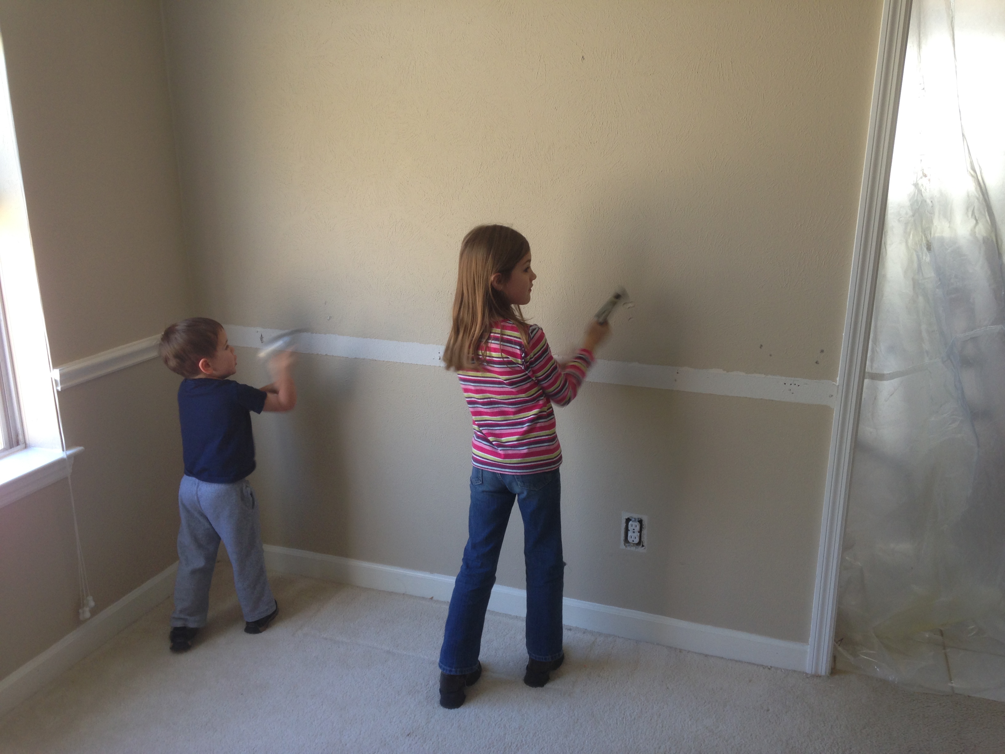 Starting on demo of the wall between the dining room and the kitchen. Mandy and Evan getting in on the action.