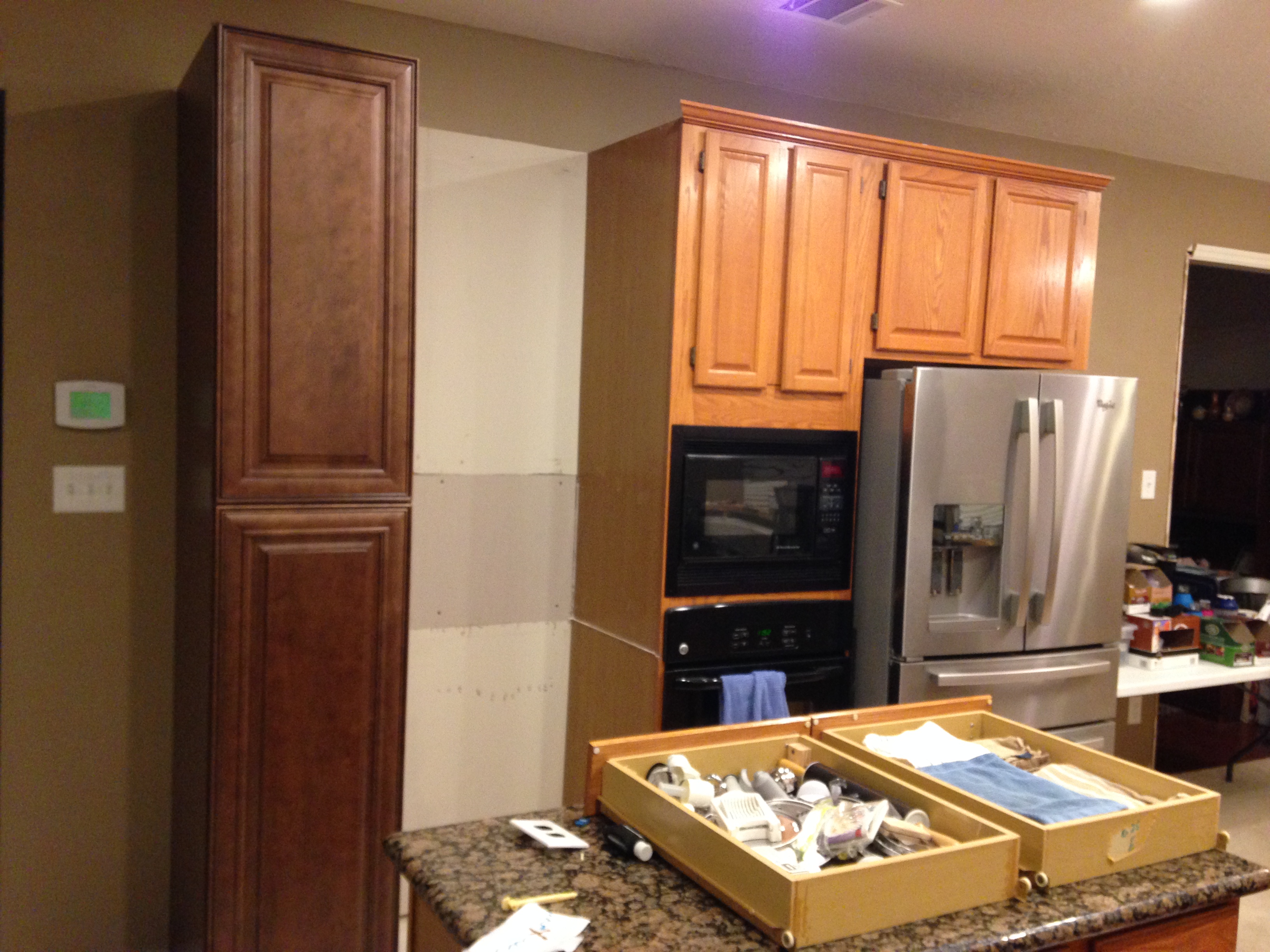 Old back splash removed and the first 18" pantry cabinet installed.