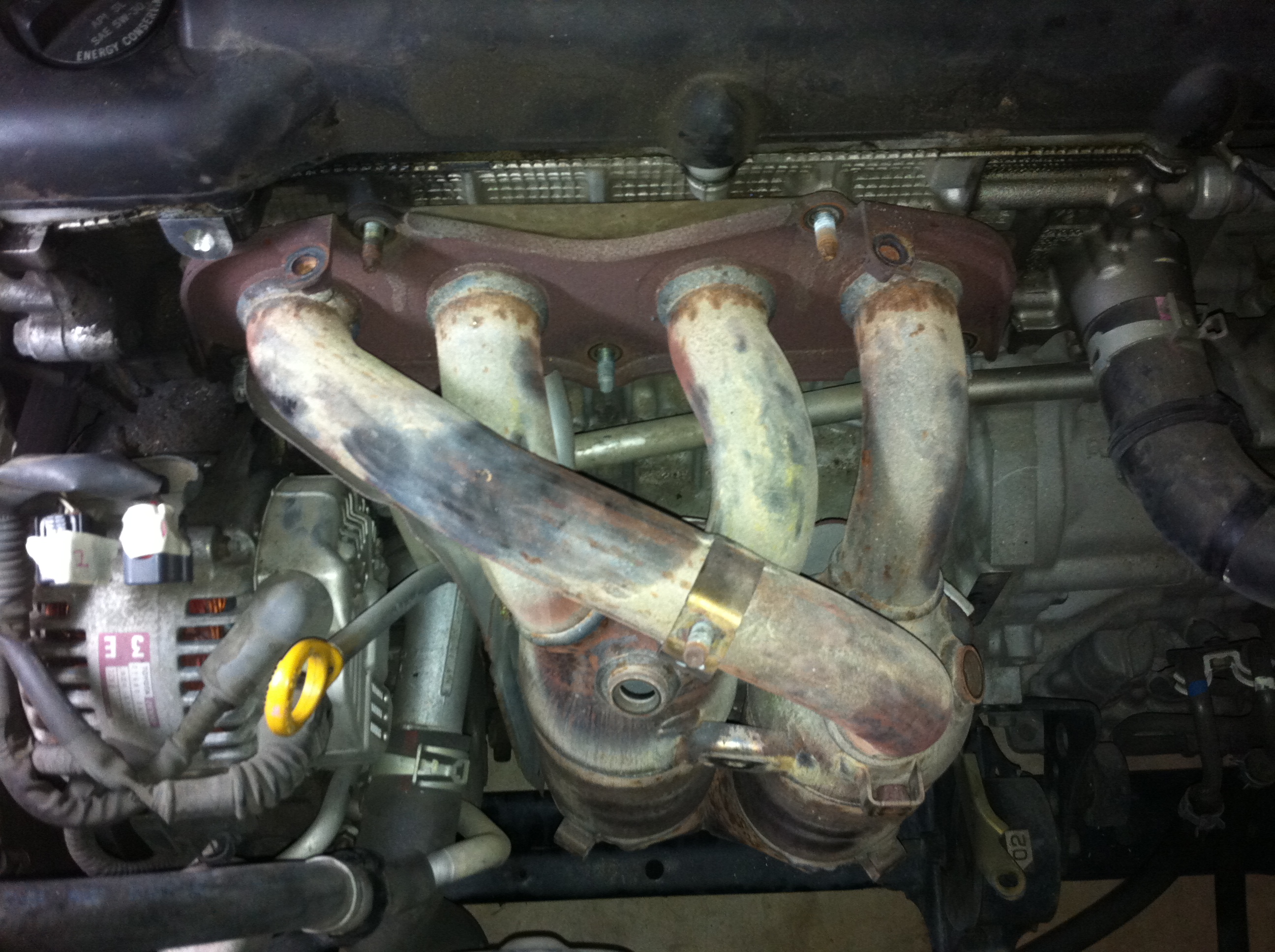 With the heat shields and O2 sensors removed. One of the nuts holding the top flange one was pretty hard to get to - the one barely visible on the lower left of the flange behind the pipe going to one of the cats. I had to remove an engine bracket and even then there was barely enough room to get a wrench on the bolt and work it loose.