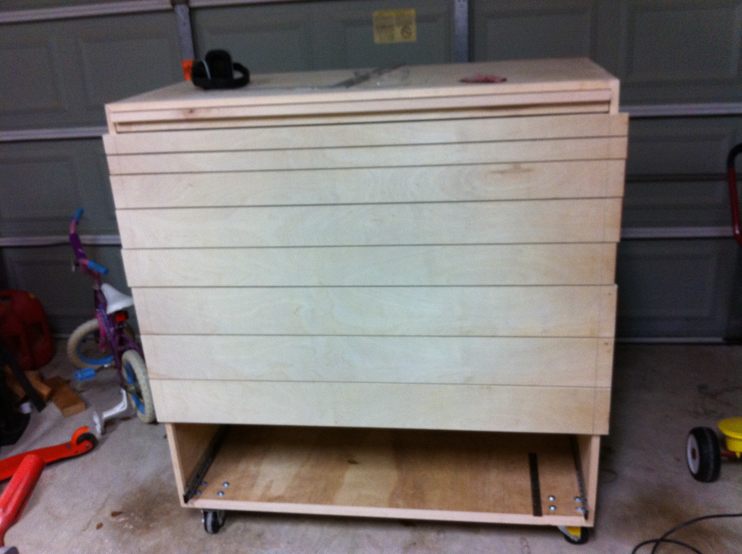 I've now reinstalled all the drawer glides and have all but the bottom drawer back in. I now also have the drawer fronts installed. I knew I'd be cutting the drawer fronts to width later so I didn't bother aligning them very precisely (side to side) which is why they look crooked. But this really ended up bugging me! The top drawer is completely finished - the drawer front is cut to width and the drawer pull is attached to the top of the drawer.
