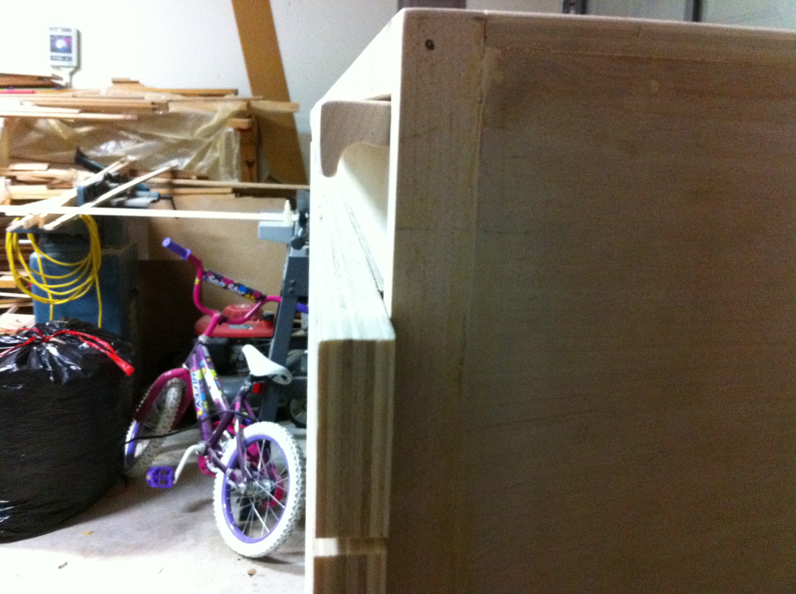 A side view of the top drawer showing the drawer pull. I made these by ripping 3/4" x 3/4" strips of maple left over from the case frame and used a cove bit to route a grove along the back edge.